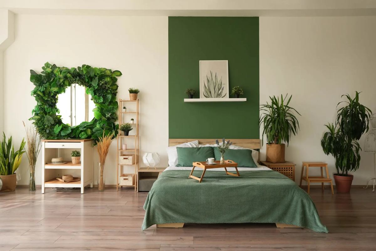 Светлая фотостудия с белой циклорамой, большим окном, постелью, зеленью. домашняя обстановка