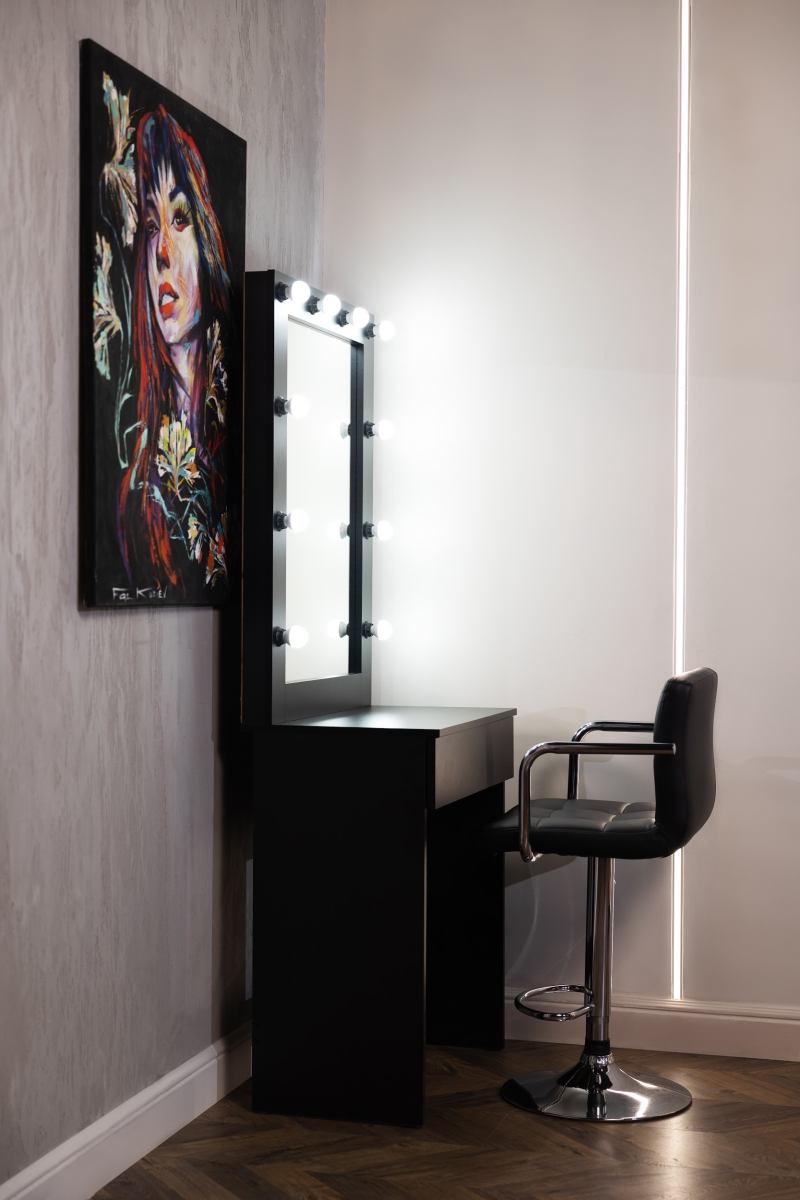 Темный зал c необычным дизайнерским решением. Подойдет для съемок подкастов, творческих съемок и различных fashion-задумок.