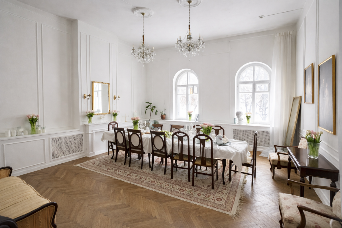 Светлая комната – элегантность и воздушность. Высокие окна, старинные зеркала, лепнина и камин создают атмосферу утончённости и вдохновения.