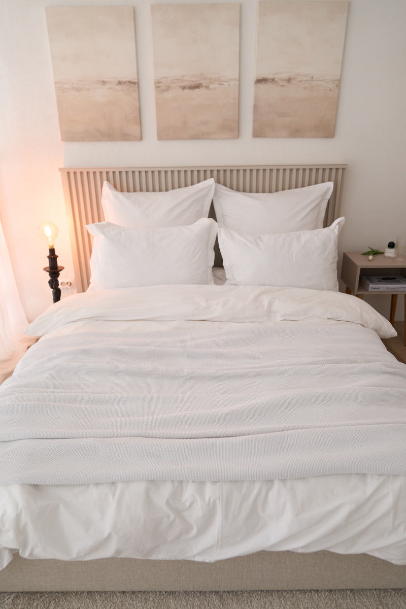 Новый, очень светлый зал с циклорамой, кроватью и панорамными окнами. Белая стена, оформленная 3D панелями"волны".