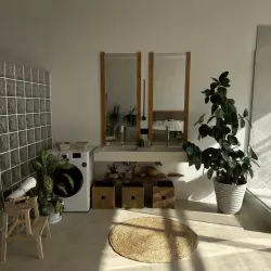 Творческое пространство с разными локациями.. белая с обрамлением, серая фактурная, растительная искусственная, кухня с большой столешницей.