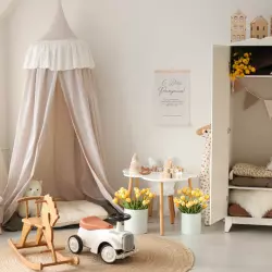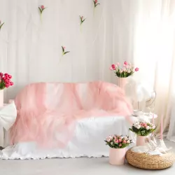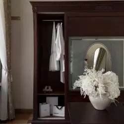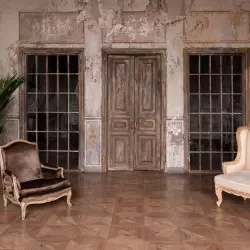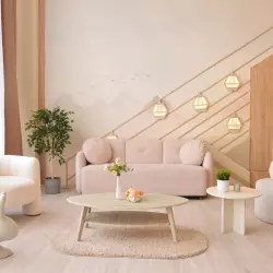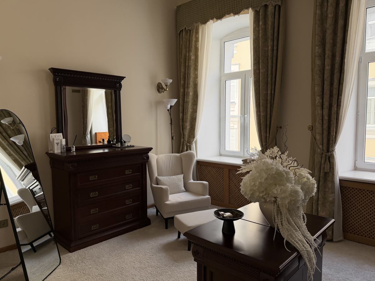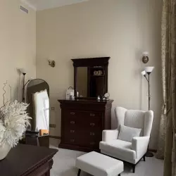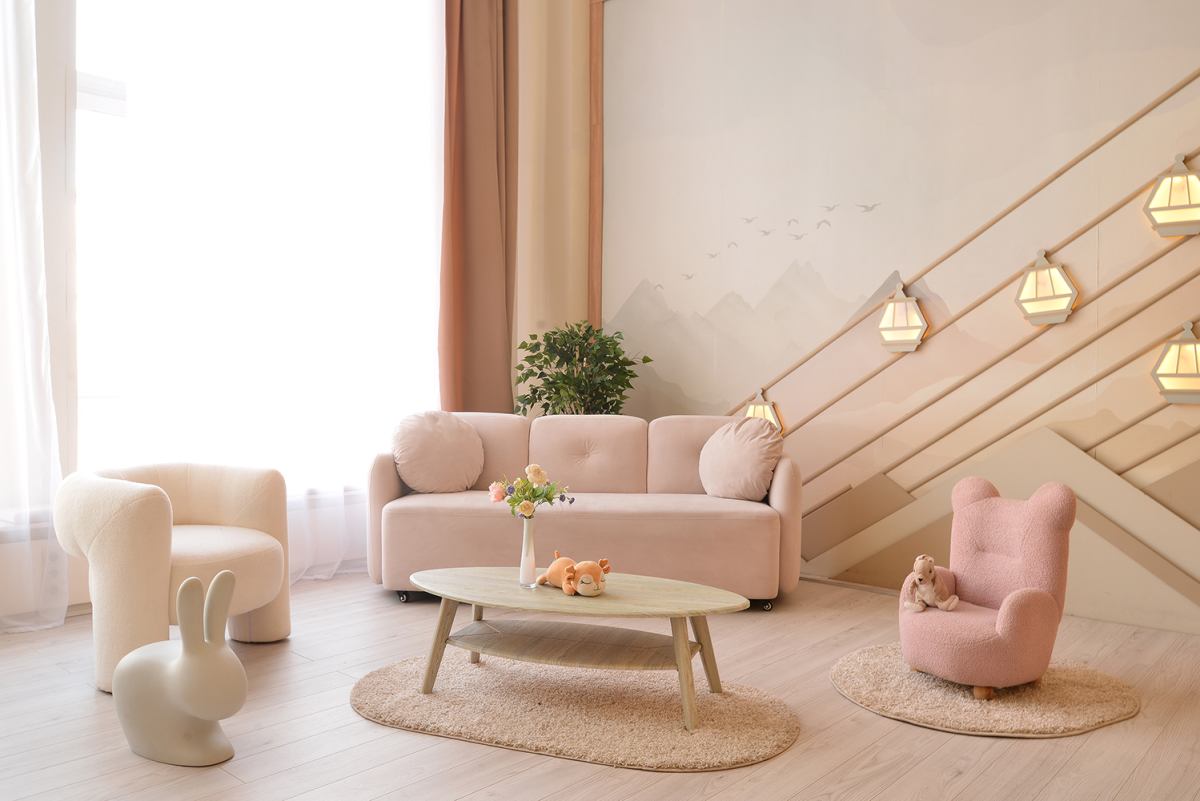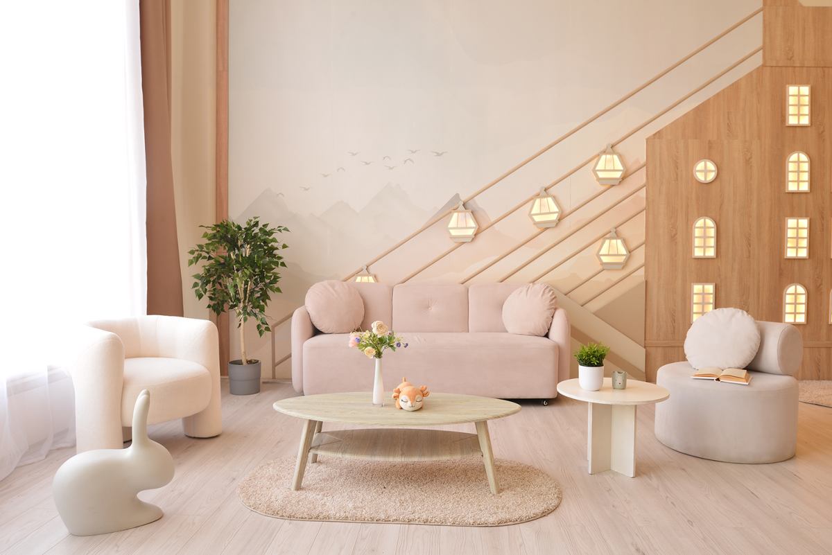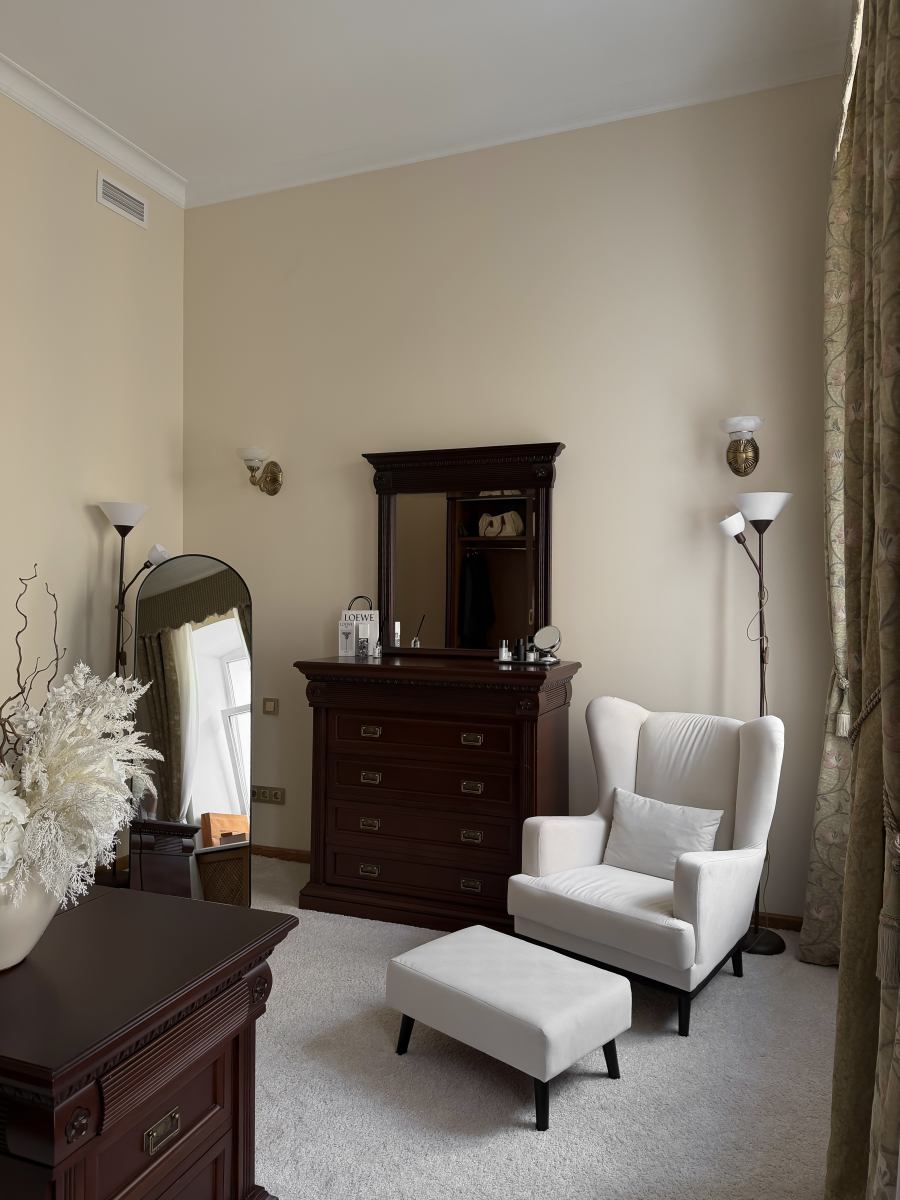 Стильный интерьерный зал с панорамными мансардными окнами и высокими потолками, в стиле европейской квартиры дизайнера, с дизайнерской мебелью и кроватью.