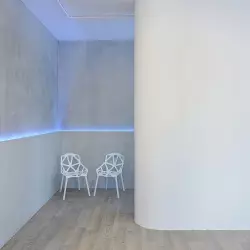 Интерьерный зал 86 м² со светлыми стенами и дизайнерской мебелью