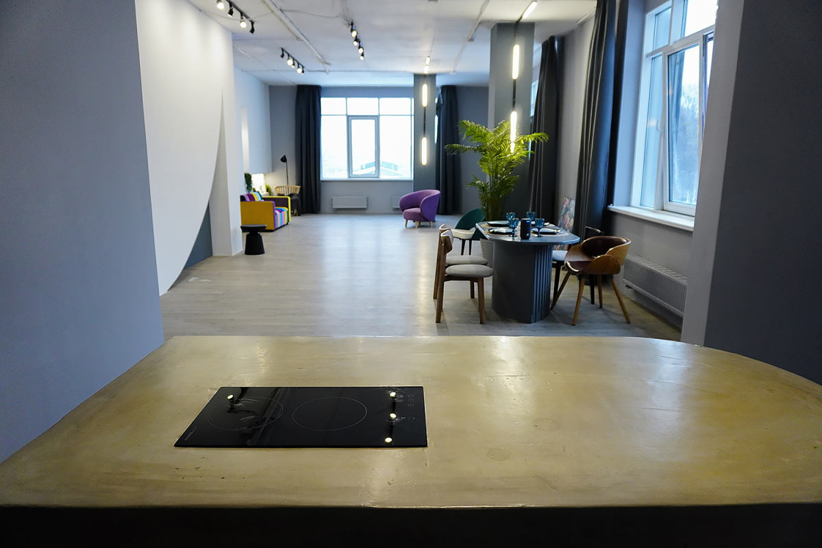 Большой зал с рабочей кухней, предвижными стенами, возможностью размещения больших съемочных групп.