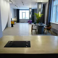 Просторное помещение с высокими потолками, панорамными окнами, неоновой подсветкой и блэк-аут шторами для полного контроля над светом. Уютная зона отдыха и удобное расположение сделают процесс съемки комфортным.