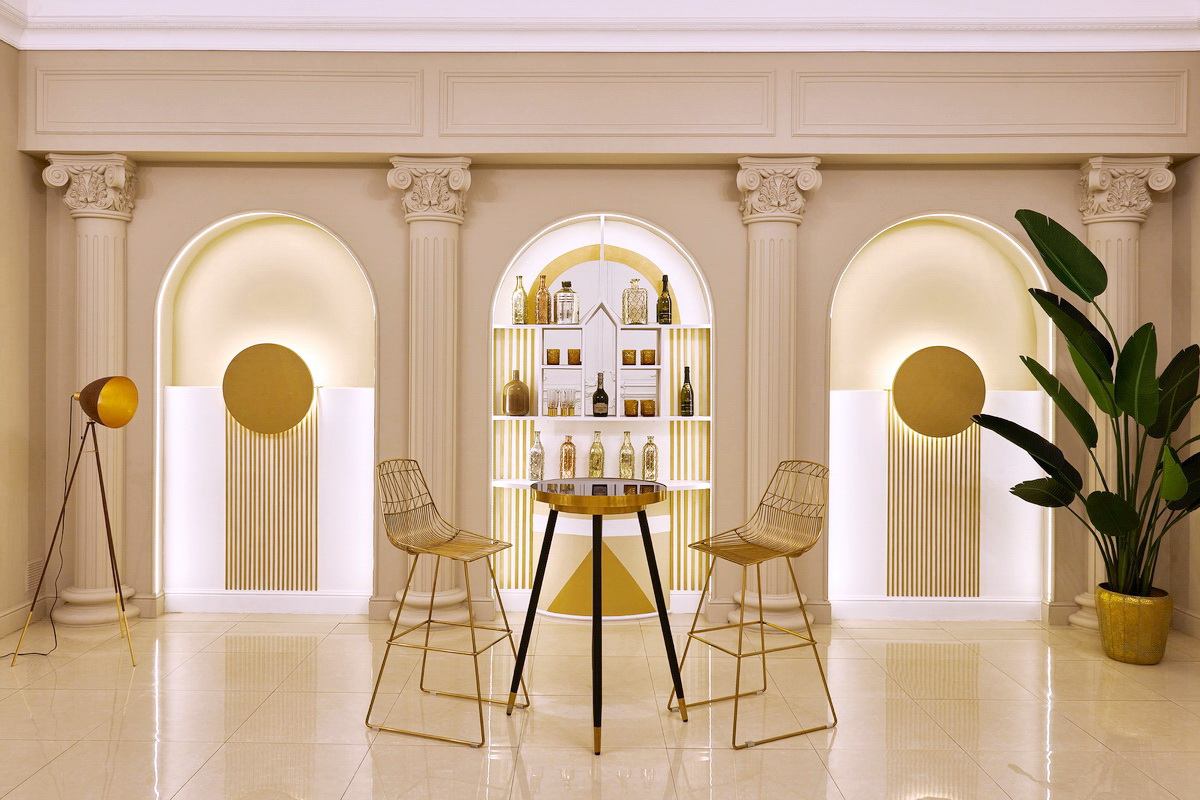 Классический светлый зал с дизайнерской мебелью, мотивами ар-деко и яркими акцентами.