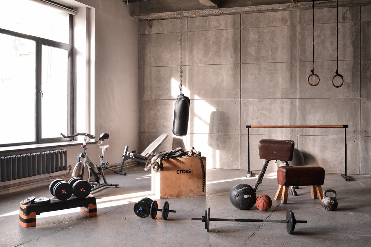 Классический лофт с олдскульной качалкой. Большой набор спортинвентаря.