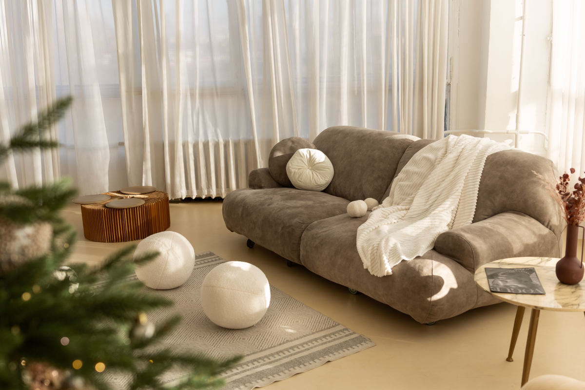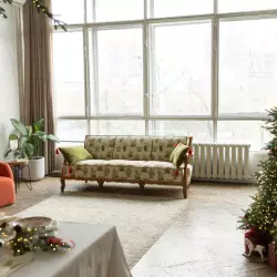 Светлое пространство с естественным светом, уютной аркой, стильным диваном и полом в "елочку".