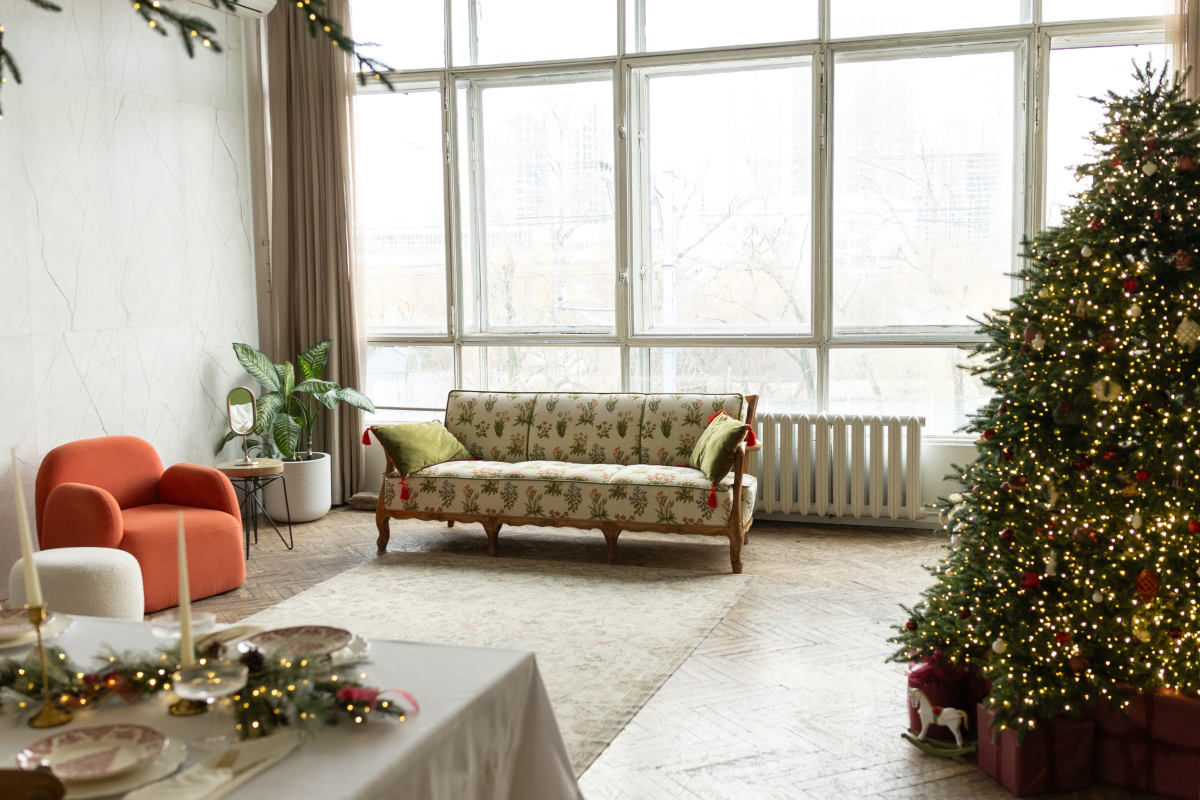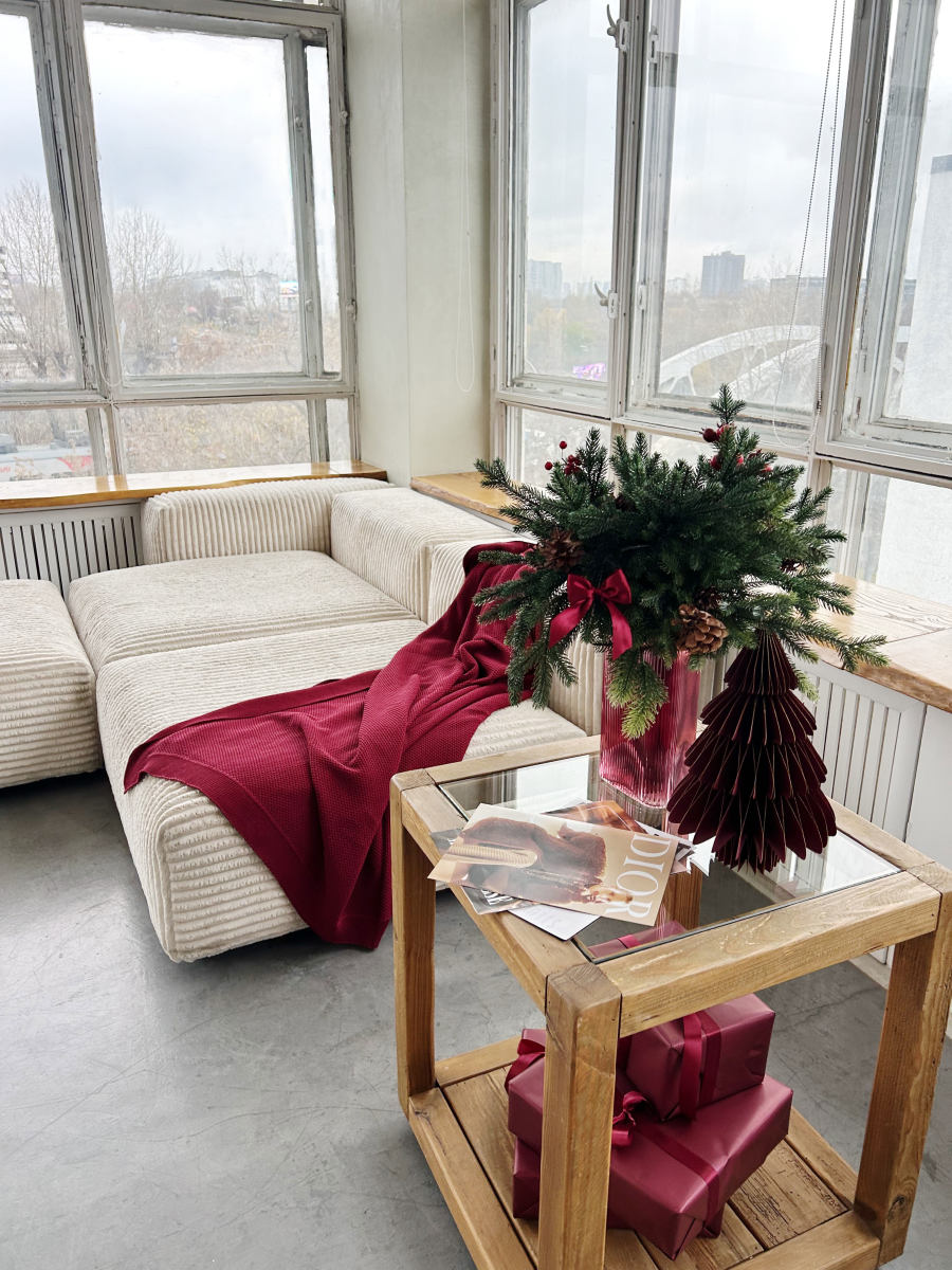 Зал в светлых тонах, 9 этаж, панорамные окна, красивый новогодний декор, имитация гостиной и кухни, однотонные и дизайнерские фоны (тканевые и бумажные), белая стена, профессиональное оборудование.