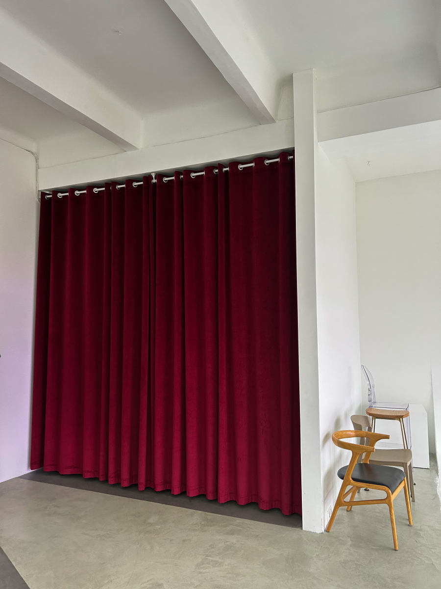 Темный зал c необычным дизайнерским решением. Подойдет для съемок подкастов, творческих съемок и различных fashion-задумок.