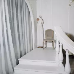 60 кв. м., потолок 5 метров, большое окно 5×3 метра на солнечную сторону. Тёмно-серые шторы блэкаут. Большой выбор тканей, фонов и предметов интерьера, идеально сочетающихся друг с другом.