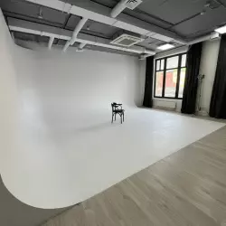 Большой светлый зал с большой угловой циклорамой (5м х 4.25м х высота 3.35м), с высокими потолками, новыми большими окнами, наполнен естественным светом даже в пасмурную погоду.