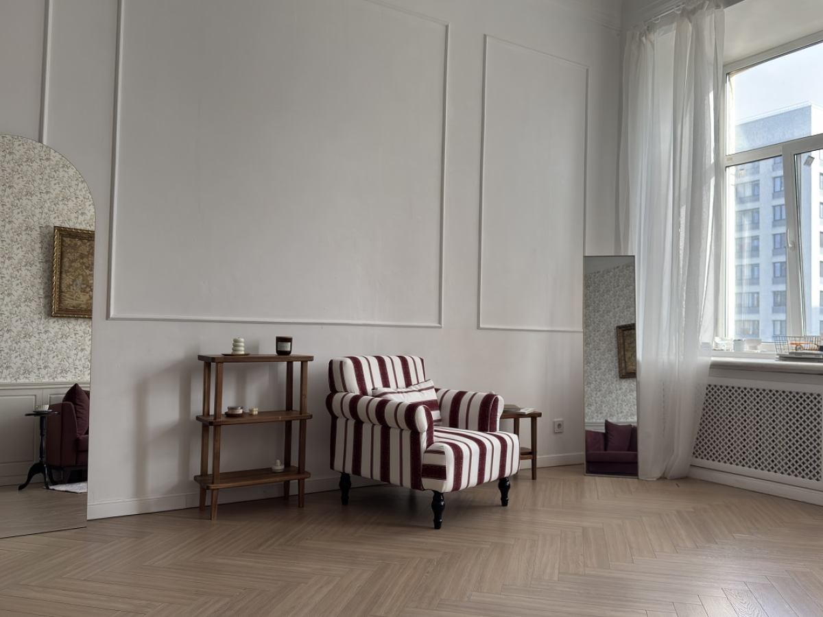 Светлый зал с тремя окнами и винтажными интерьерными зонами. Для портретных, съёмок лукбуков, брендов, маркетплэйсов, портфолио.