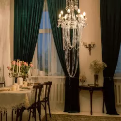 Зал Муза — Светлый зал с живописным состаренным полом, стены и потолки красивых сложных оттенков зеленых, охровых и бежевых цветов, старинный плинтус по периметру комнаты. Зал наполнен уникальной винтажной мебелью, хрусталем, коврами и живыми растениями. В зале также находится старинное, немецкое пианино и дубовая кровать с балдахином