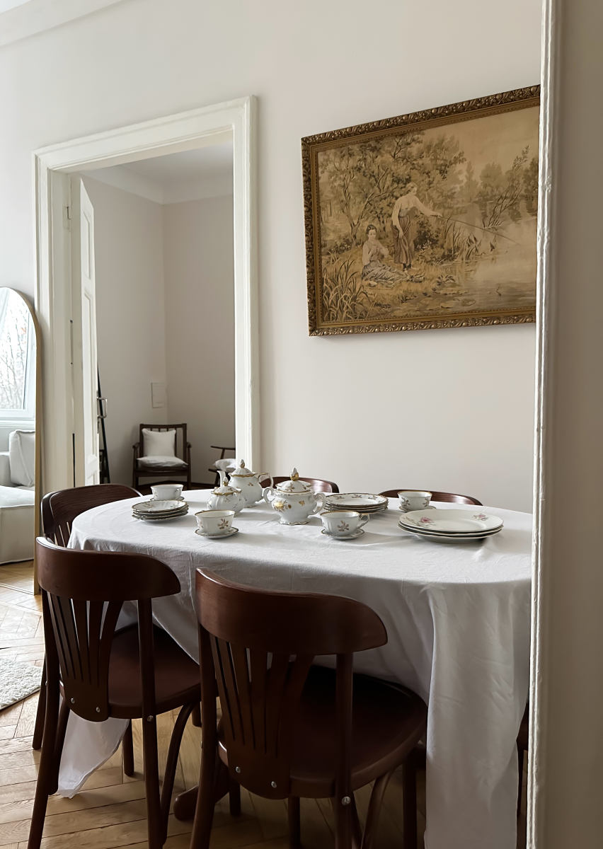 Светлый зал в стиле европейской квартиры с антикварной мебелью, лепниной и паркетом «ёлочкой». Две комнаты: столовая с сервировкой и гостиная с мягкой зоной. Большие окна, естественный свет, винтажные детали. Удобно для съёмок с командой, проведения лекций и мастер-классов.
