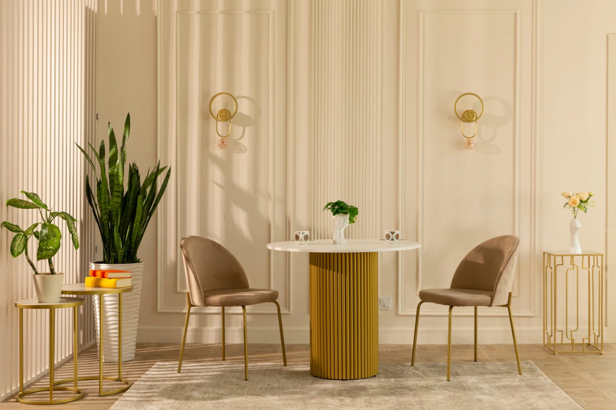 Интерьерный зал 86 м² со светлыми стенами и дизайнерской мебелью