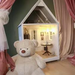 Детская и семейная фотостудия в СВАО. Зал разделен на 2 части: интерьерные локации для уютных съемок и белая циклорама.