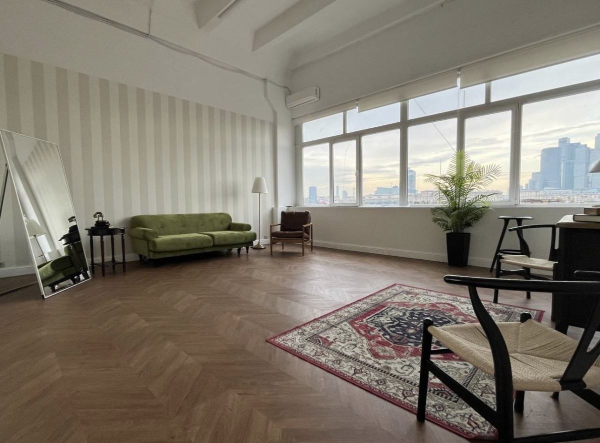 Большой зал с рабочей кухней, гостиной, спальней, кабинетом и прихожей. К залу примыкает собственная гримерная комната. Для больших команд есть комната отдыха, грузовой лифт, возможность хранения техники и реквизита.