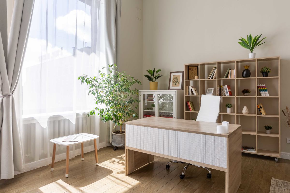 Панорамные окна, коричневый паркет, светлые и фактурные стены.