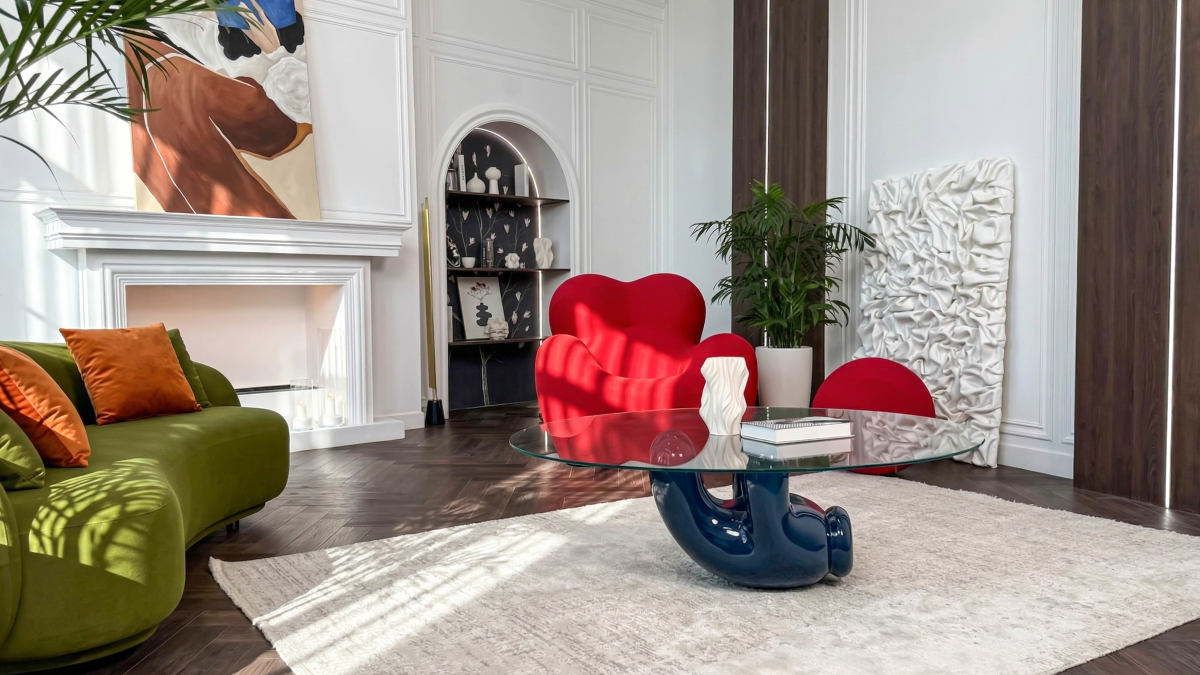 Классический светлый зал с дизайнерской мебелью, мотивами ар-деко и яркими акцентами.