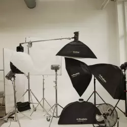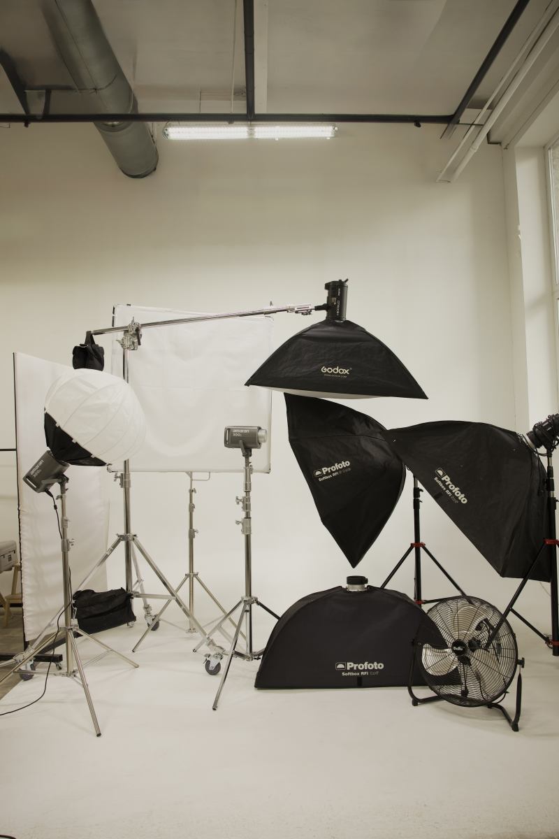 Два окна с блэк-аут шторами и полный комплект профессионального осветительного оборудования Profoto.