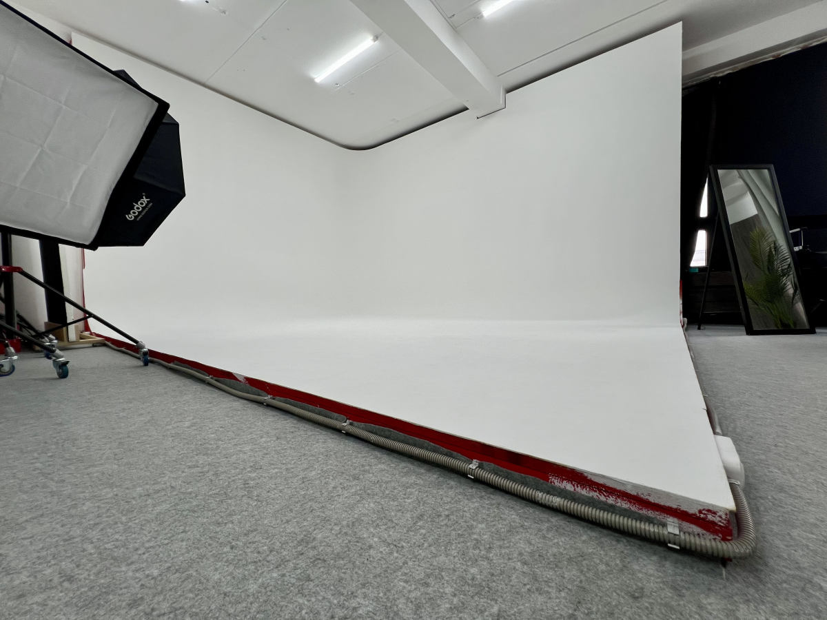 Белая, П-образная циклорама шириной 18 метров, с возможностью полного перекраса в необходимый цвет. Высота потолков 6 метров.