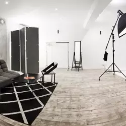 Просторный белый зал с циклорамой, металлическими фактурами и зоной для записи интервью и подкастов с возможностью арендовать микрофоны и микшер.