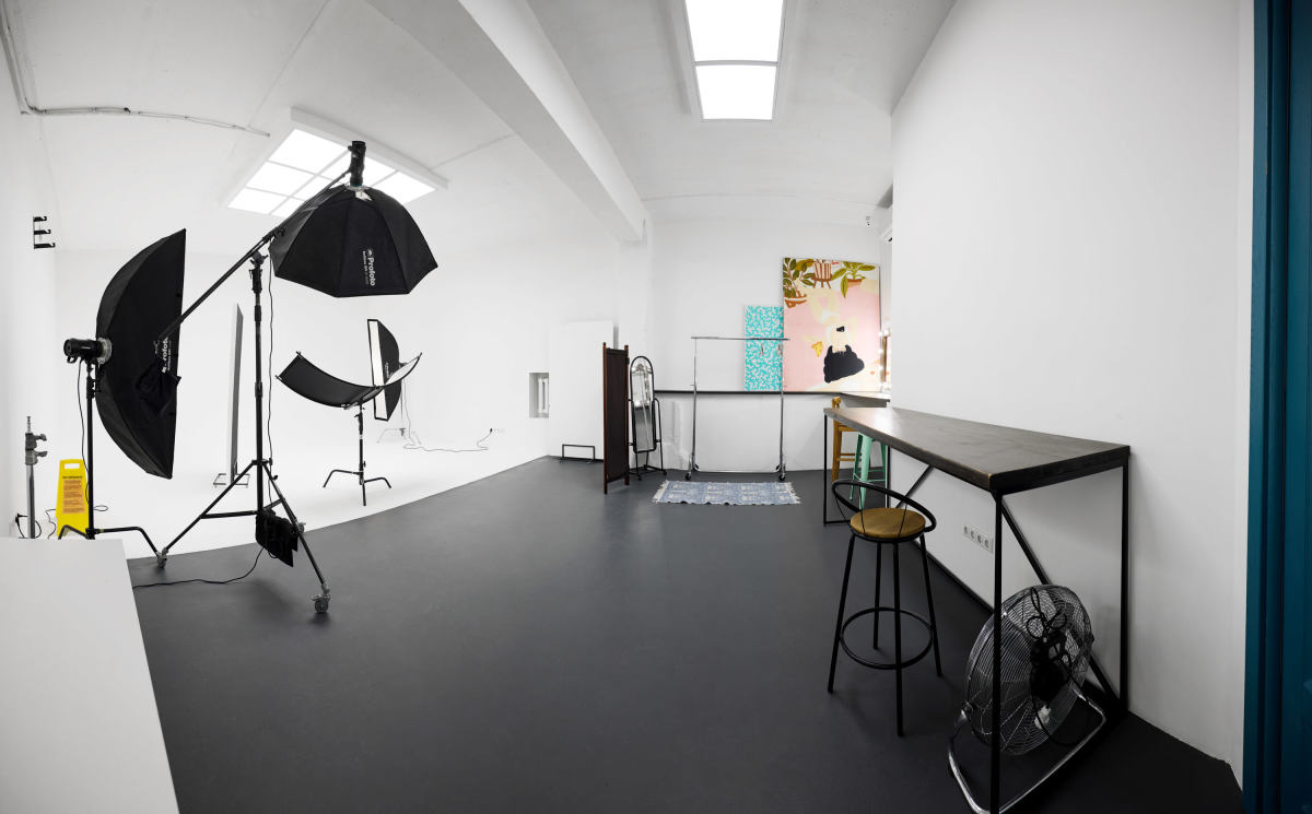 Белый зал с угловой циклорамой, огромные окна, прямой солнечный свет с утра до вечера.