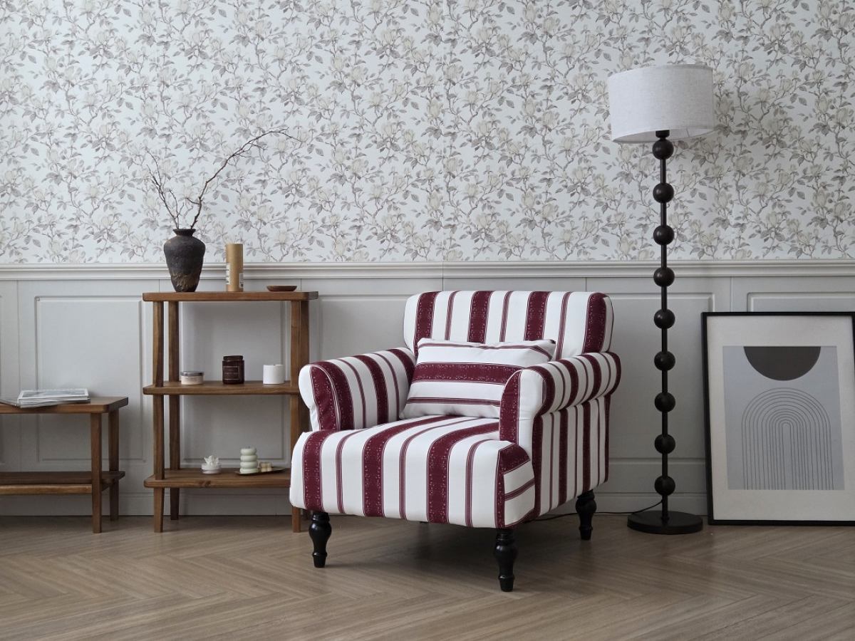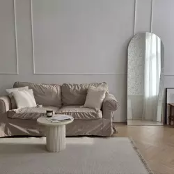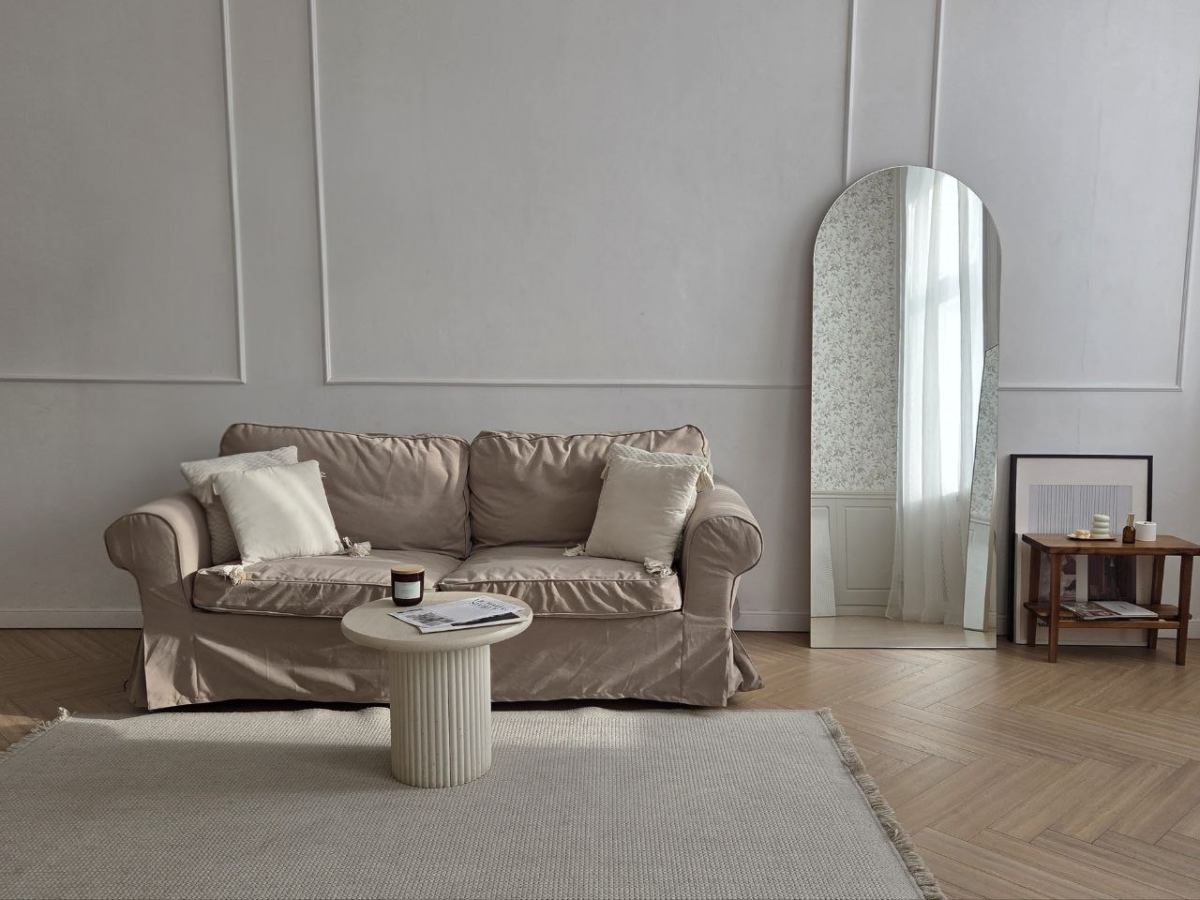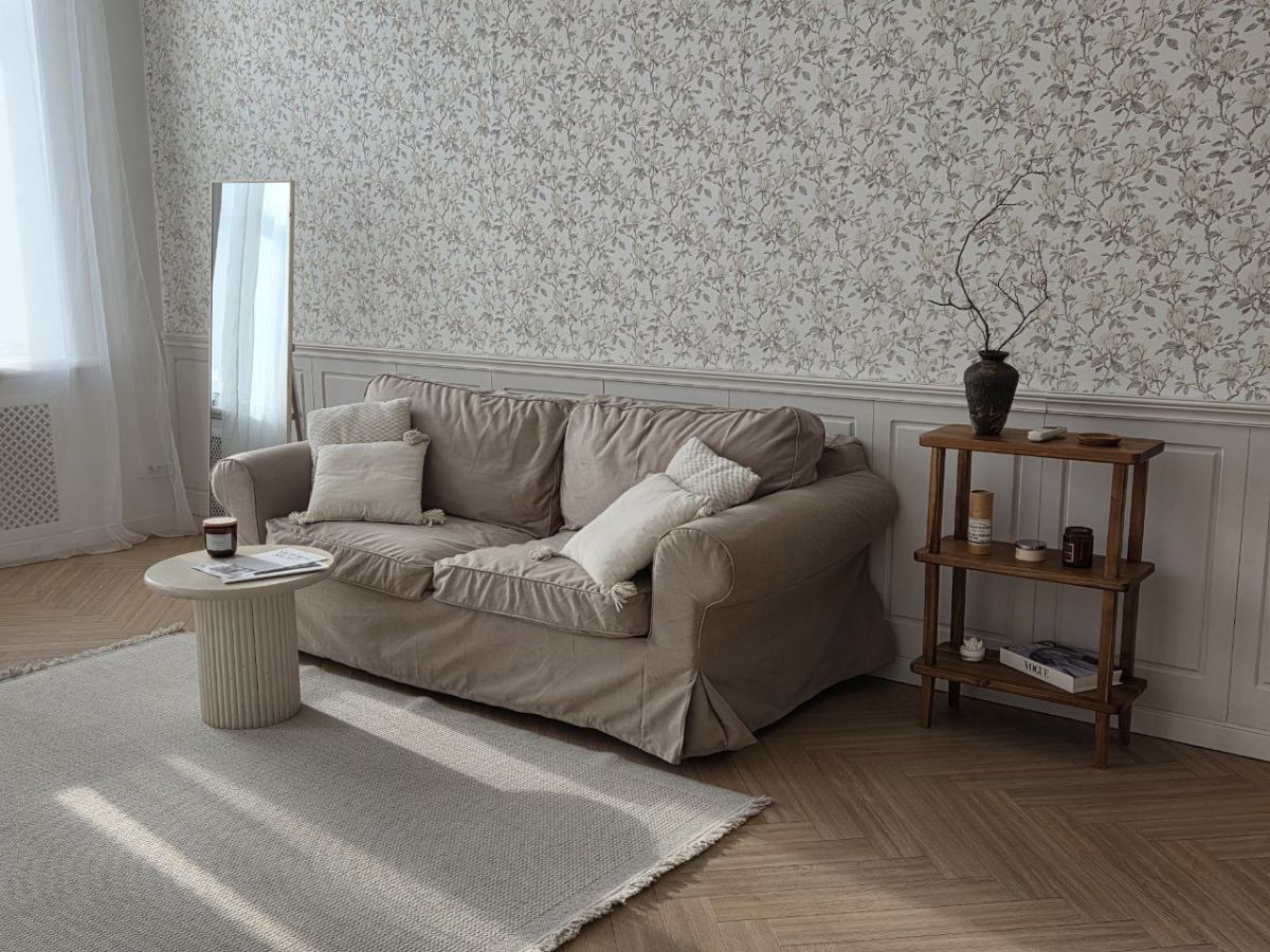Светлое пространство с естественным светом, уютной аркой, стильным диваном и полом в "елочку".