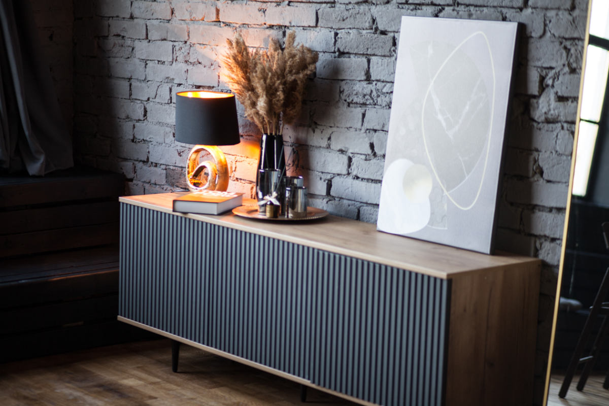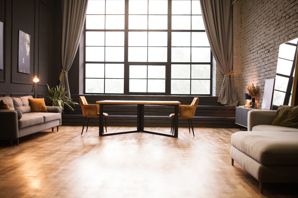 Зал в серых тонах в стиле неоклассики, минимализма и лофта.