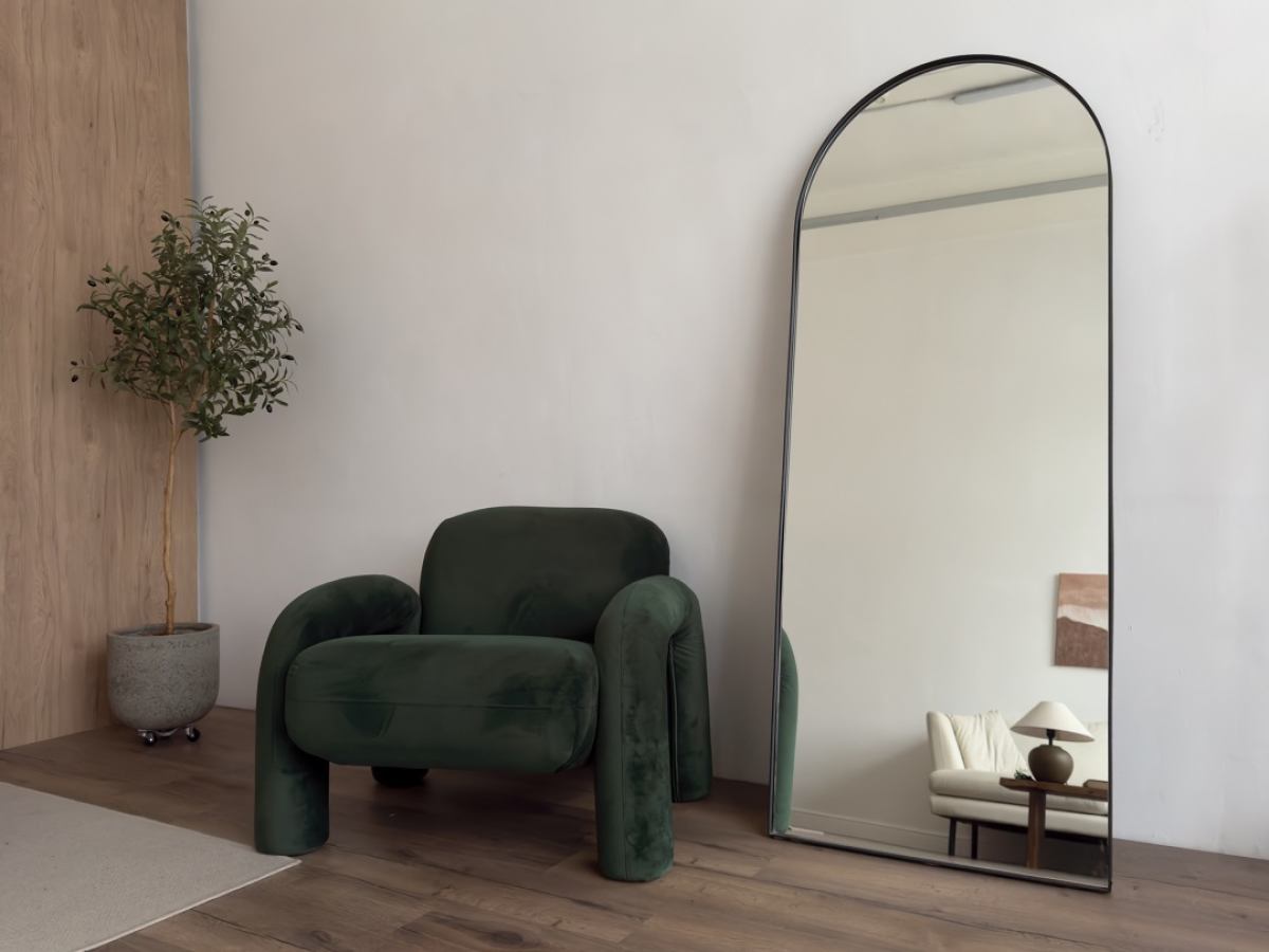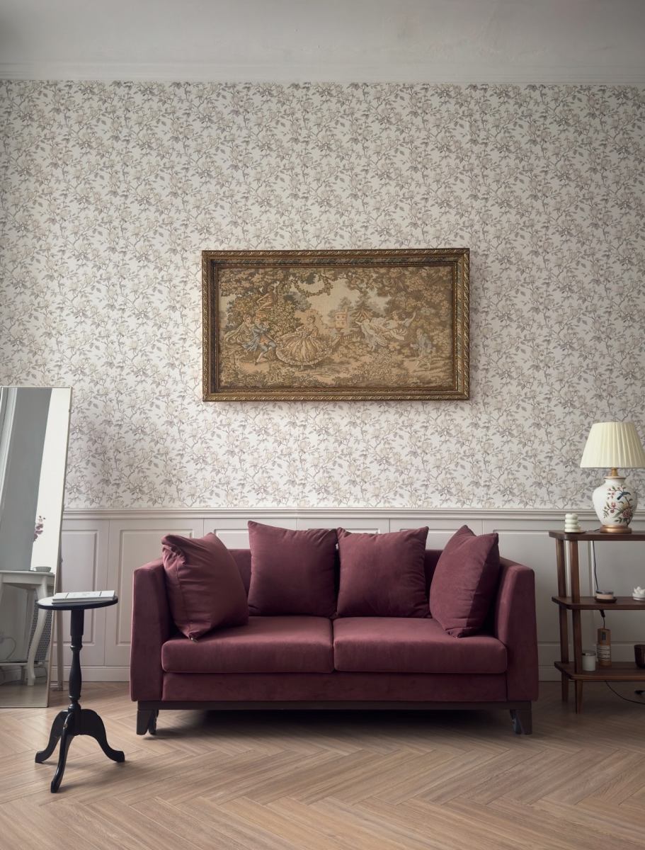 Светлое пространство с естественным светом, уютной аркой, стильным диваном и полом в "елочку".