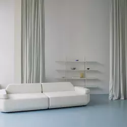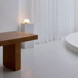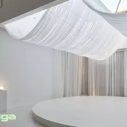 Дерево, обработанное особым образом, создает ощущение не поддельной грубой ручной работы. Контраст дерева дополняет авторский диван из белой шерсти. Очень светлый зал с циклорамой и освещением по двум сторонам.