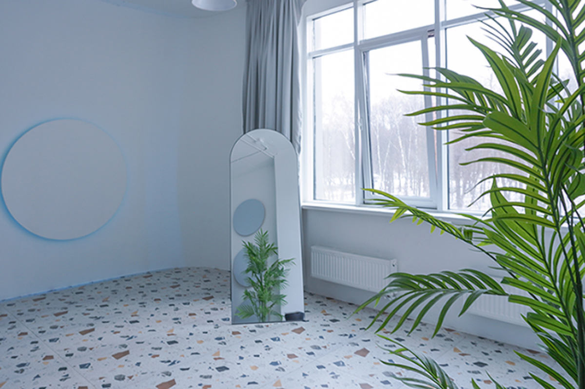 Самый просторный зал студии, с огромным окном куполом – атриумом, с круглым белым подиумом под ним. Матовый наливной пол трех оттенков. Окно из стеклоблоков.
