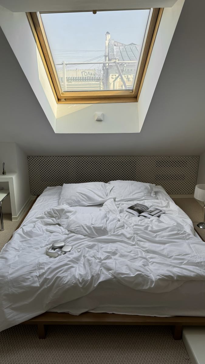 Кровать с белоснежным постельным бельем, естественный свет, изысканная мебель и картины