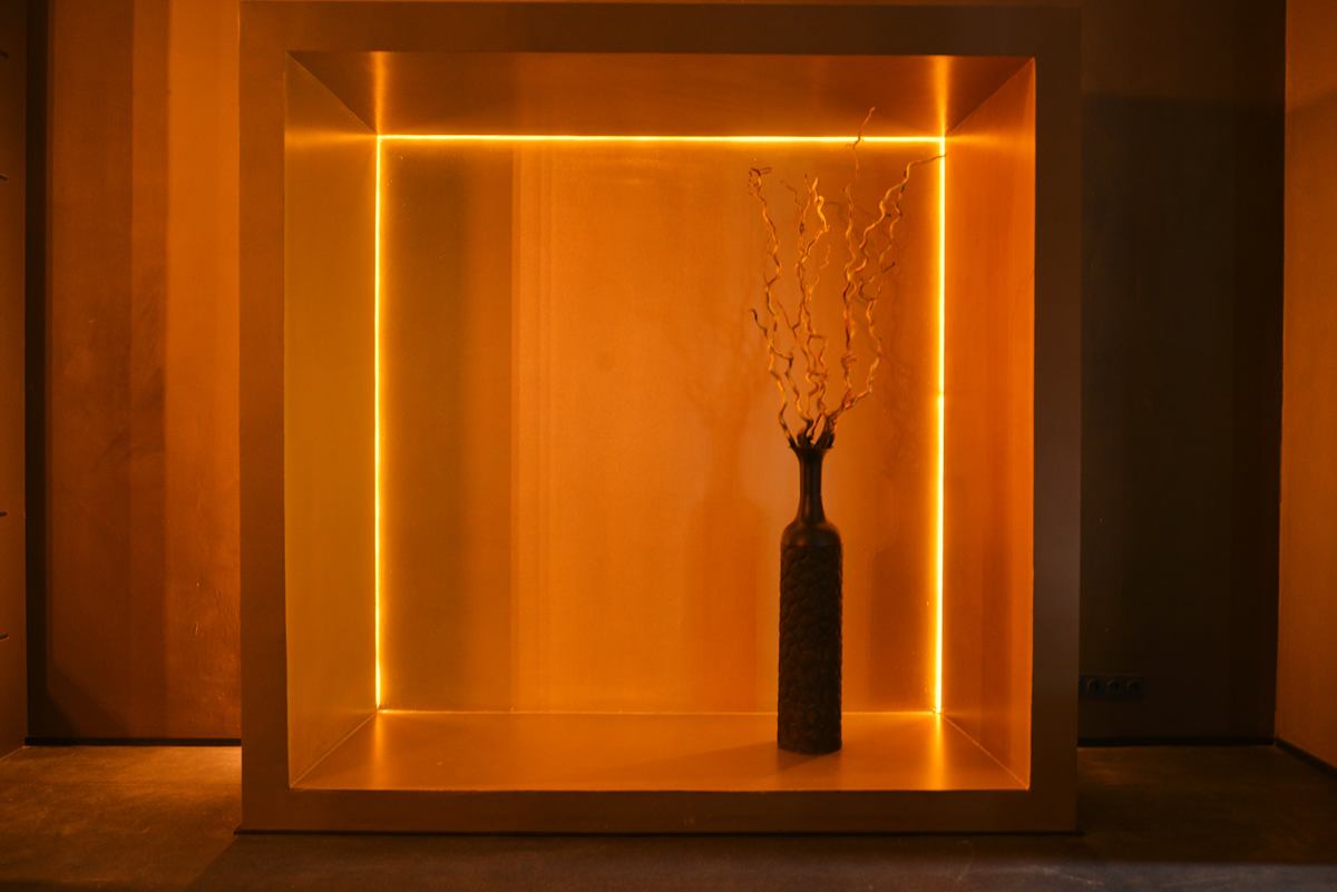 Стильный тёмный зал с архитектурными формами, фактурными стенами и тёплой встроенной подсветкой. Контраст света и текстур создаёт выразительную, стильную атмосферу. Подойдёт для fashion-съёмок, портретов, контента для брендов, экспертных видео и интервью.