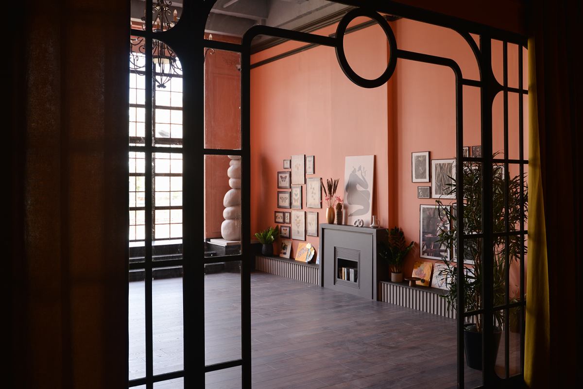 Классический светлый зал с дизайнерской мебелью, мотивами ар-деко и яркими акцентами.