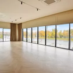 Большой зал, апартаменты, полностью рабочая кухня с островом (индукц. плита, духовка, вода, холодильник, посудомойка), гостинная, спальня. Окна с 2х сторон зала. 8 больших окон - 80м2, 1-й этаж
