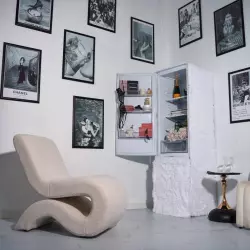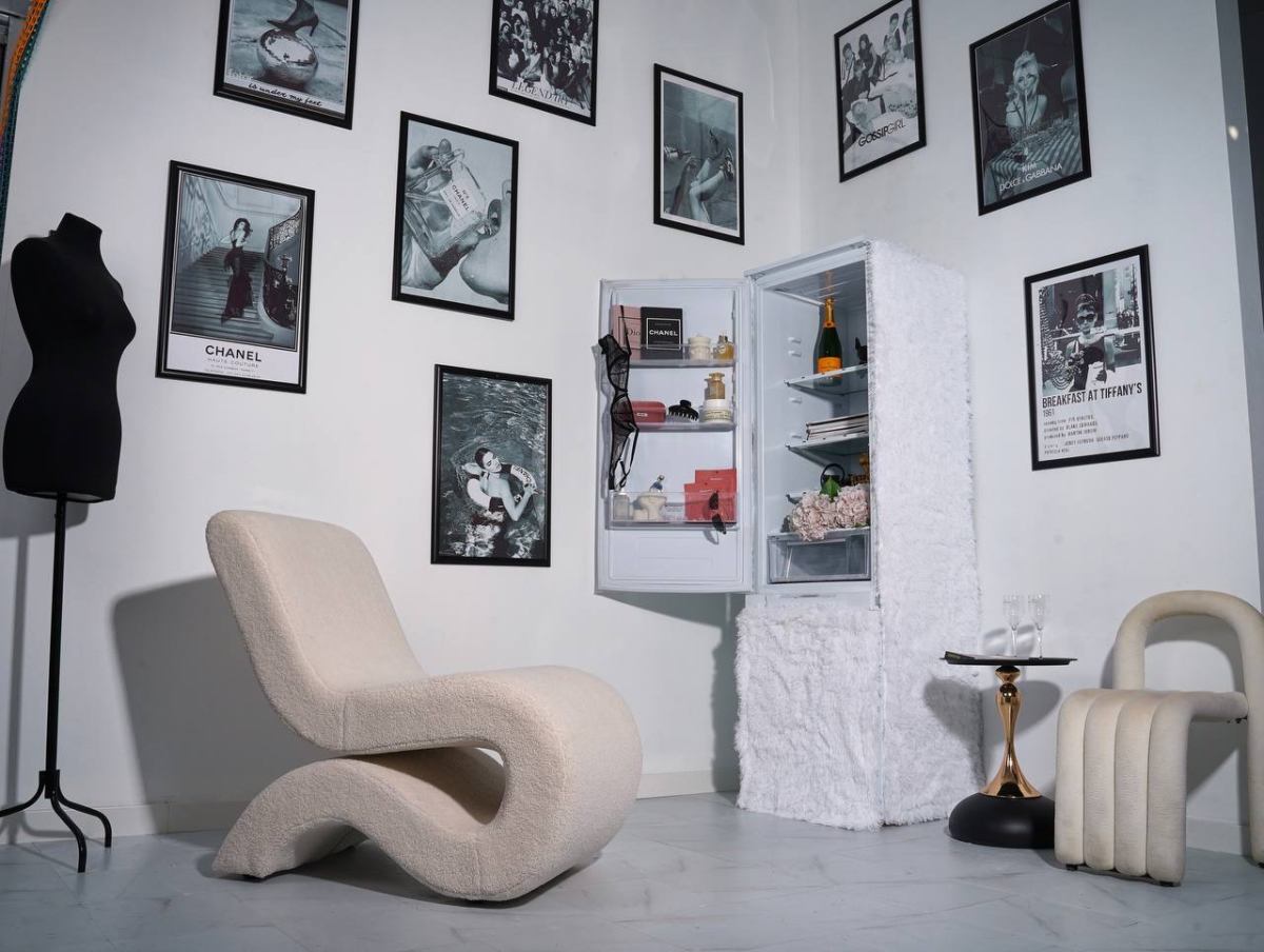 Интерьерный зал 86 м² со светлыми стенами и дизайнерской мебелью