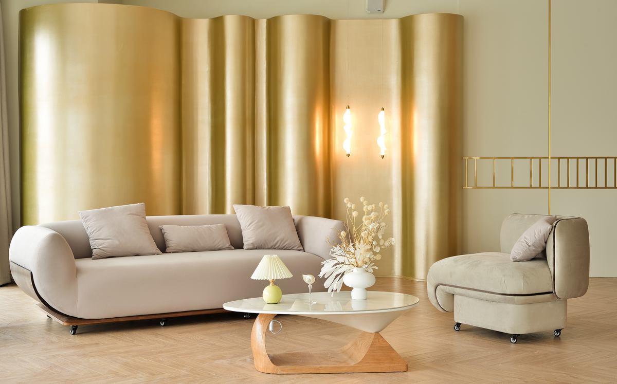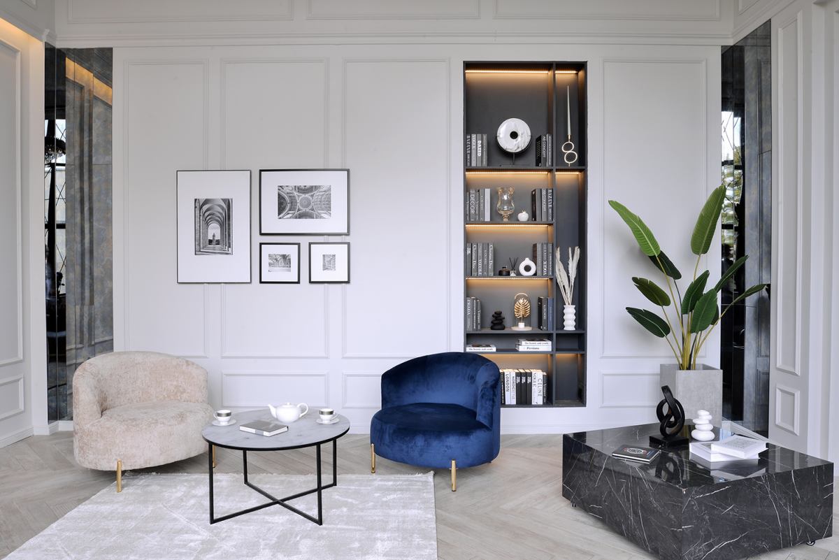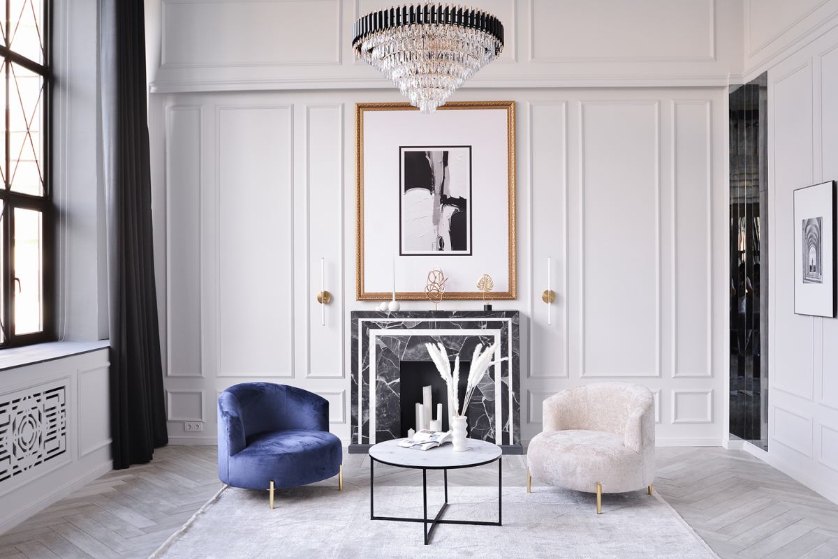 Классический светлый зал с дизайнерской мебелью в фотостудии премиум класса