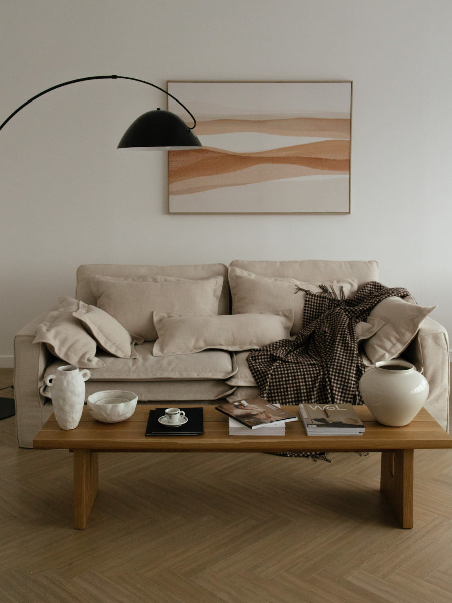 Современный минимализм в светлых тонах с большими панорамными окнами: большой диван-трансформер, кресло, стол из слэба дерева, новогодний интерьер, фотофоны, гримерный стол, естественный свет