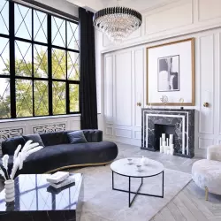 Историческое пространство с лепниной, паркетом, эркерными окнами в пол и современной мебелью.