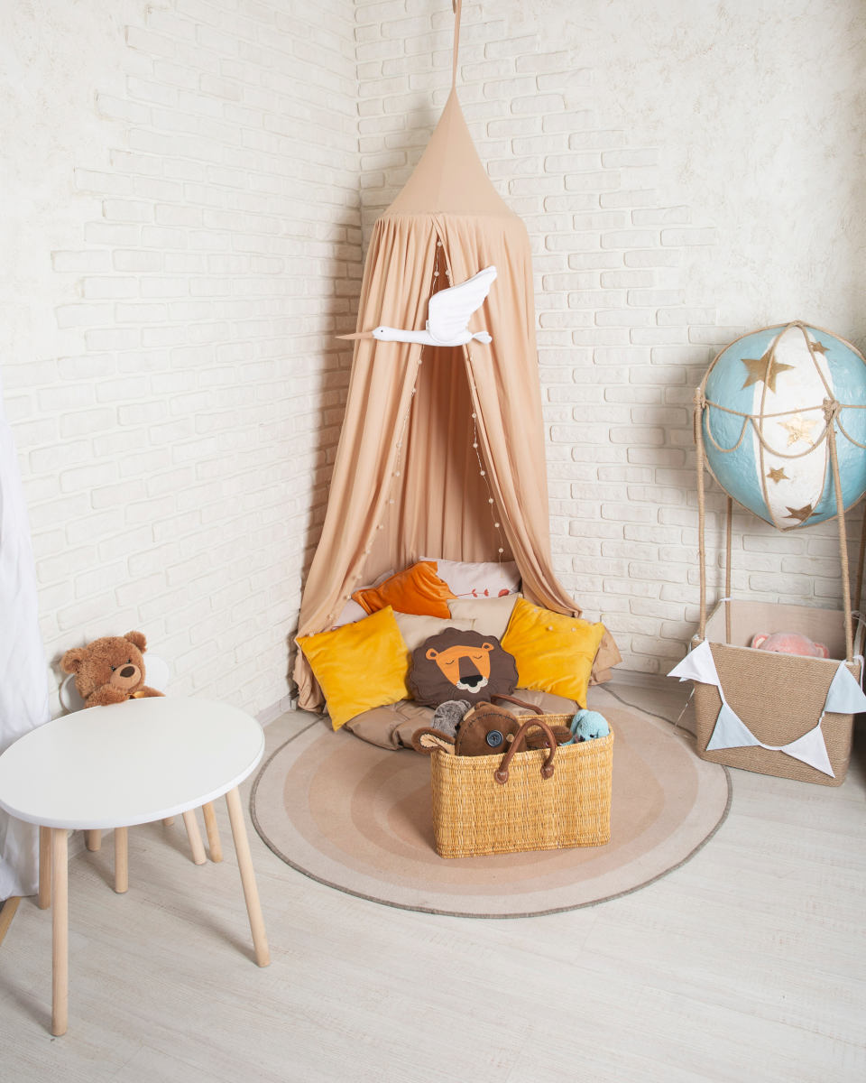 - Каминная зона с бело-голубо-золотой елью, подвесными звездами и лошадкой-качалкой;
