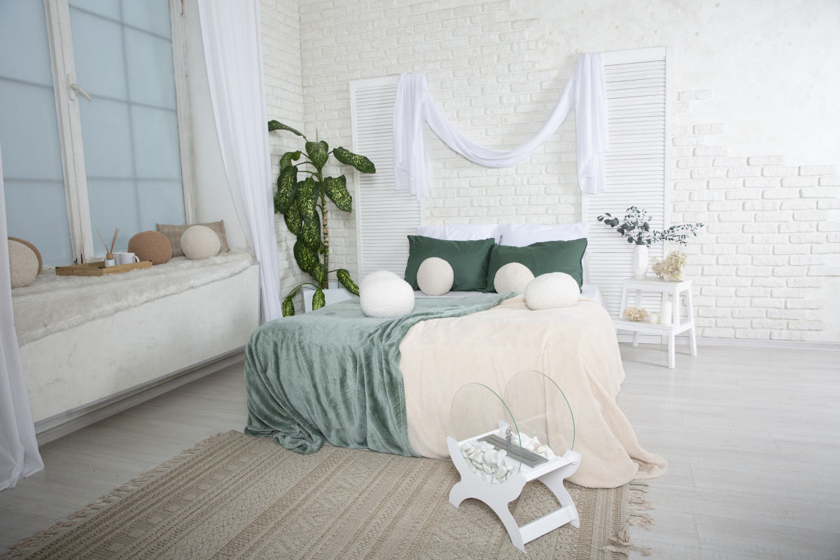 Белый зал с кроватью и огромным окном. Подходит для съемки каталожки, есть зона имитирующая гардероб с большим зеркалом с лампочками
