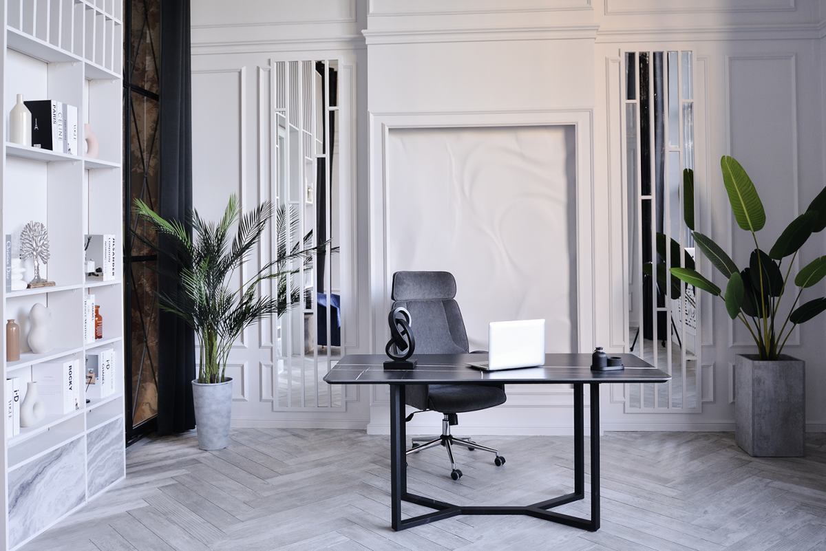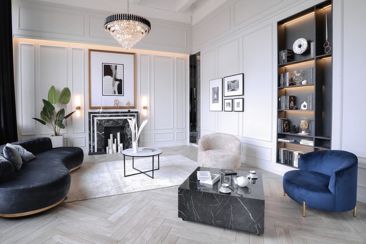 Классический светлый зал с дизайнерской мебелью в фотостудии премиум класса