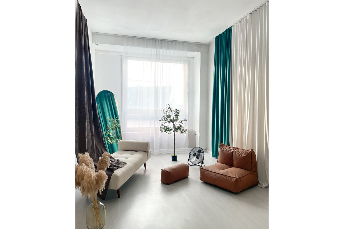 Интерьерный светлый зал с огромными панорамными окнами, выходящими на юг, что даёт яркий падающий свет в дневное время, возможность полного затемнения. Белый пол, наибольшая концентрация современных трендов и фактурных зон в одном зале. Возможность установки любого фона из наличия, высокие потолки, гримёрное место.