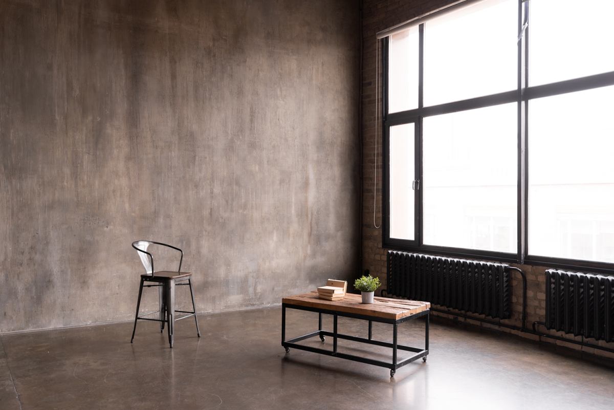 Стильное лофт пространство с высокими потолками и большими окнами.
