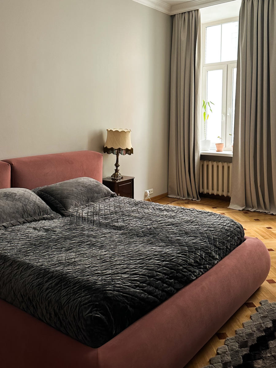 Уютный светлый интерьер с спальной зоной, гардеробной и гостиной.