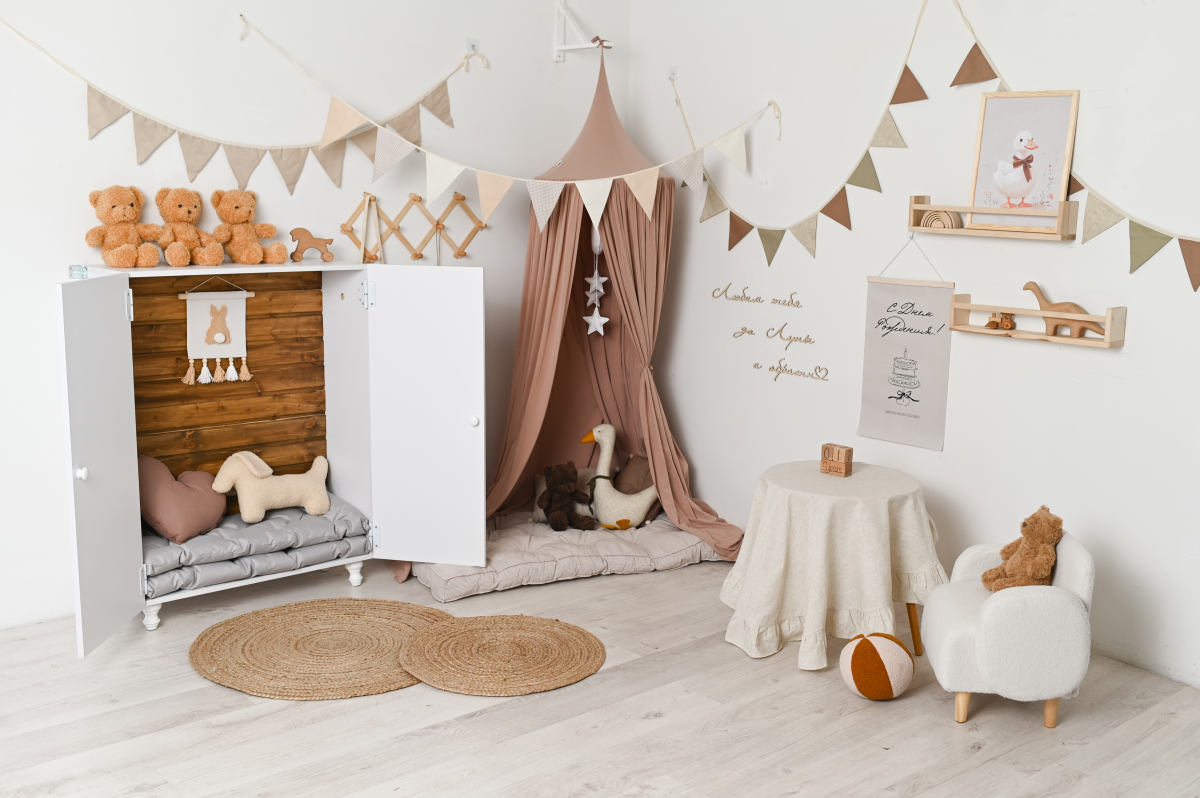 В зале установлены декорации в стиле детской модной комнаты.