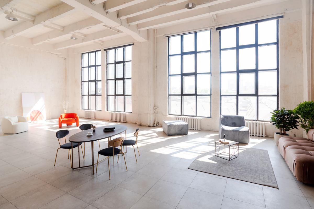 Лофтовый интерьерный зал с тонким сочетаниями цветов, фактур и оттенков.
