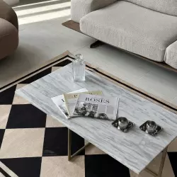 Стильный неоклассический интерьер, сдержанные цвета, огромные окна в пол.